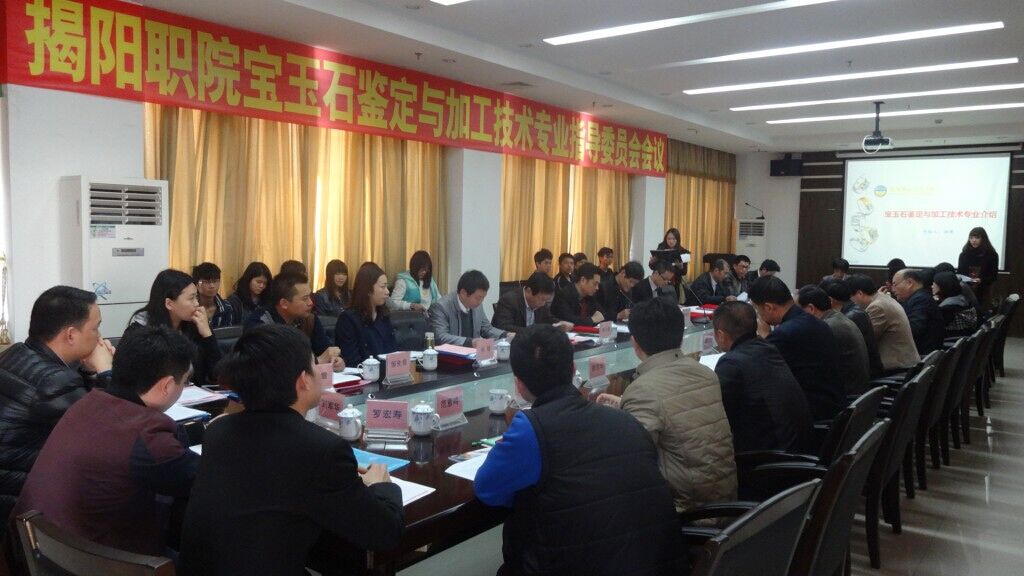 1月9日下午,在行政楼507会议厅召开我院宝玉石鉴定与加工技术专业指导委员会会议。出席会议的委员共20人,包括翡翠玉雕传承人、亚洲珠宝玉雕大师、广东贵雅天下工艺有限公司总经理夏浩真,亚洲珠宝玉雕大师、高级工艺美术师张炳光、郑少山,揭阳市工艺美术协会副会长林少波,揭阳日报社采访部副主任陈镇文,深圳市深祥珠宝有限公司人事总监钟亮,深圳市爱迪尔珠宝有限公司副总经理刘丽、人力总监刘雪、爱迪尔珠宝(惠州)分公司经理邹先奇,深圳市粤豪珠宝有限公司培训部经理赖建勇;学院出席会议的人员有:学院院长龚善初、副院长姚玉平、教务处处长黄英铭、实训与信息中心主任邢南亮、机电工程系领导和宝石教研室专业教师,以及宝玉石专业学生代表。
